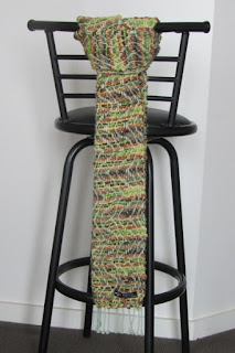 Eisaku Noro Big Bebe #11 yarn is multi-coloured with light green, light grey and dark, medium and light browns. It is a yarn made with a smooth finish but of varying thickness and consists of 38% cotton, 29% ramise, 29% wool and 4% nylon. I have used a lichen coloured Tailored Strands 4-ply Australian alpaca as the warp and the Eisaku Noro yarn as the weft.