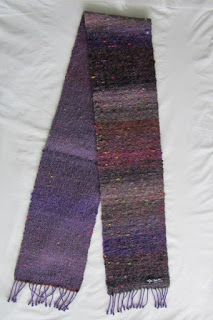 I have hand-woven a Noro Mossa #11 yarn (52% wool, 16% viscose, 11% mohair, 115 silk, 10% nylon) with a Tailored Strands lavender coloured Australian alpaca yarn to give a bulky warm-feeling scarf. Multicolours among the lavender background, this textured scarf may be reversed to give you two interesting scarves in one. And for your information the scarf is nominally 1840mm x 210mm and weighs 170g.